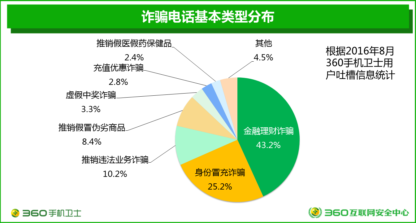 根据2016年8月360手机卫士用户的“吐槽信息”的统计分析显示,在用户接到所有的诈骗电话中,虚假的金融理财诈骗最多,占43.2%,此类诈骗在北上广深等大城市尤其盛行;其次是身份冒充诈骗,占25.2%。两类诈骗相加占比68.4%。在身份冒充类诈骗中,冒充电信运营商的诈骗数量最多,占比为26.0%;其次是冒充领导,占21.2%;排名第三的是冒充快递,占14.3%。
